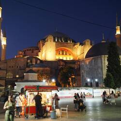 Als wir dann gegen 14:00 zum Hotel kamen, konnten wir gleich einchecken, haben uns frisch gemacht und sind eingeschlafen. Die Busfahrt war eben doch etwas anstrengend. Abends sind wir dann zum Sultan-Ahmet-Platz gegangen. Das ist der zentrale Platz, wo die Haupt Sehenswürdigkeiten sind, u.a. die Hagia Sofia. Es ist von unserem Hotel gleich um die Ecke. Nein, unser Hotel ist nicht teuer, aber es hat eine schöne Dachterasse, auf der auch gefrühstückt wird. Am Sultan-Ahmet-Platz gab es Stände mit gerösteten Maiskolben und Maroni und einen fliegenden Teeverkäufer und ein paar Lokum hatten wir uns auch noch besorgt.