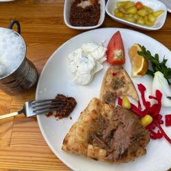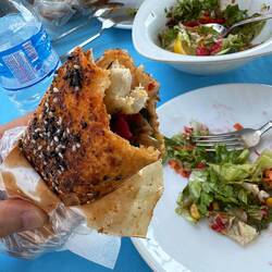 In einem Strandcafé haben wir Pide mit Käse und lecker aussehende Desserts gegessen und dabei die wechselnden Farben des Meeres während des Sonnenuntergangs beobachtet.Read more