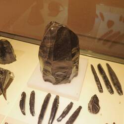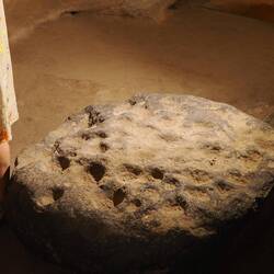 Hinter dem Eingang kommt der große Tempel, von dem, wie bei den meisten Gebäuden, nur die Grundmauern aus Naturstein erhalten sind. Darauf befand sich früher eine Konstruktion aus Holz und Lehm. Das Holz wurde in Löchern befestigt, die man in die Steine mit dem zur Verfügung stehenden Kupferwerkzeug gebohrt hat. In diesem Tempel findet man auch den grünen Stein, der doch recht besonders aussieht. Ihm wurden diverse Dinge zugeschrieben, er soll z.B. aus Ägypten stammen. Tatsächlich handelt es sich aber um eine lokale Steinart und man weiß nicht um irgendeine besondere Bedeutung des Steins.