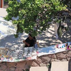 Morgens sind wir in die blaue Moschee gegangen, eine der Hauptattraktionen hier. Ein endloser Strom an Touristen wälzt sich hinein. Man wird auf die Kleiderordnung hin kontrolliert - Männer lange Hosen, Frauen ein Kopftuch - und muss vor dem Eingang noch die Schuhe ausziehen - dafür gibt es innen dann Ablagen. Innen ist das eine beeindruckende verschachtelte Ansammlung von Kuppeln, die prächtig mit Mosaiken und Kalligraphien verziert sind. Die Geschichte dazu hatten wir vorher gelesen.