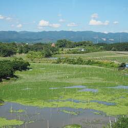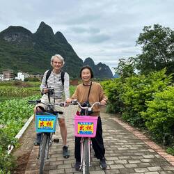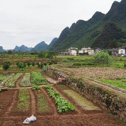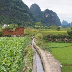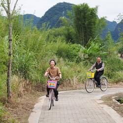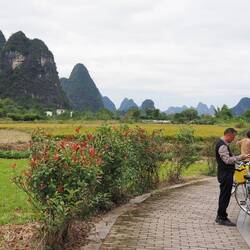 Im Teil drei sind wir per etwa eineinhalb Stunden mit dem Fahrrad auf einem Radweg an einem kleineren Nebenfluss entlang gefahren. Die Fahrräder waren schlicht und unkompliziert, aber recht neu und für die gemütliche Fahrt genau richtig. Man fuhr auf einem Radweg zwischen vielen kleinen und kleinsten Feldern entlang. Nur hin und wieder kam so ein elektrischer Scooter daher, die in China ja sogar auf Fußwegen fahren dürfen.
