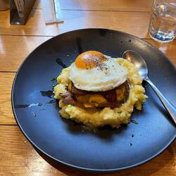 Der Hamburger war dann sehr originell, nämlich ohne Brötchen und statt dessen mit Kartoffelbrei. In der Speisekarte stand auch irgendwas vom Ursprung der Hamburger. Das habe ich nicht gelesen, es war irgendwas mit Hamburg im 17. Jhdt. Später habe im Internet nach Hamburger mit Kartoffelbrei gesucht und auch tatsächlich was in der „Für Sie“ Zeitschrift gefunden, was ähnlich aussah.