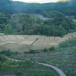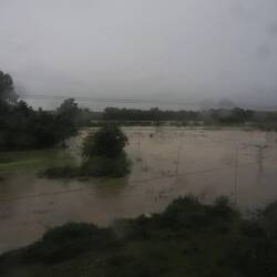 Die Landschaftsbilder aus dem Fenster zeigen die Gegend in China vor der Grenze und drei Bilder in Laos.