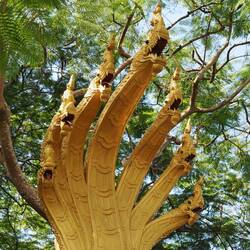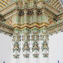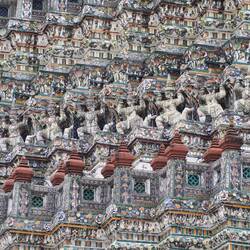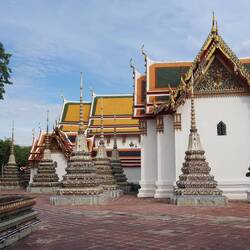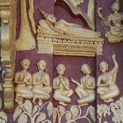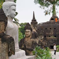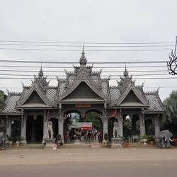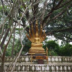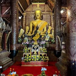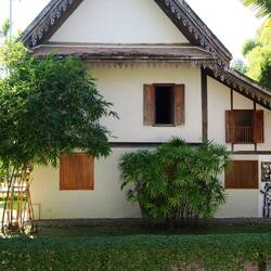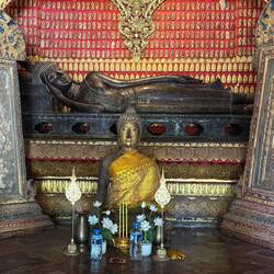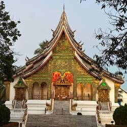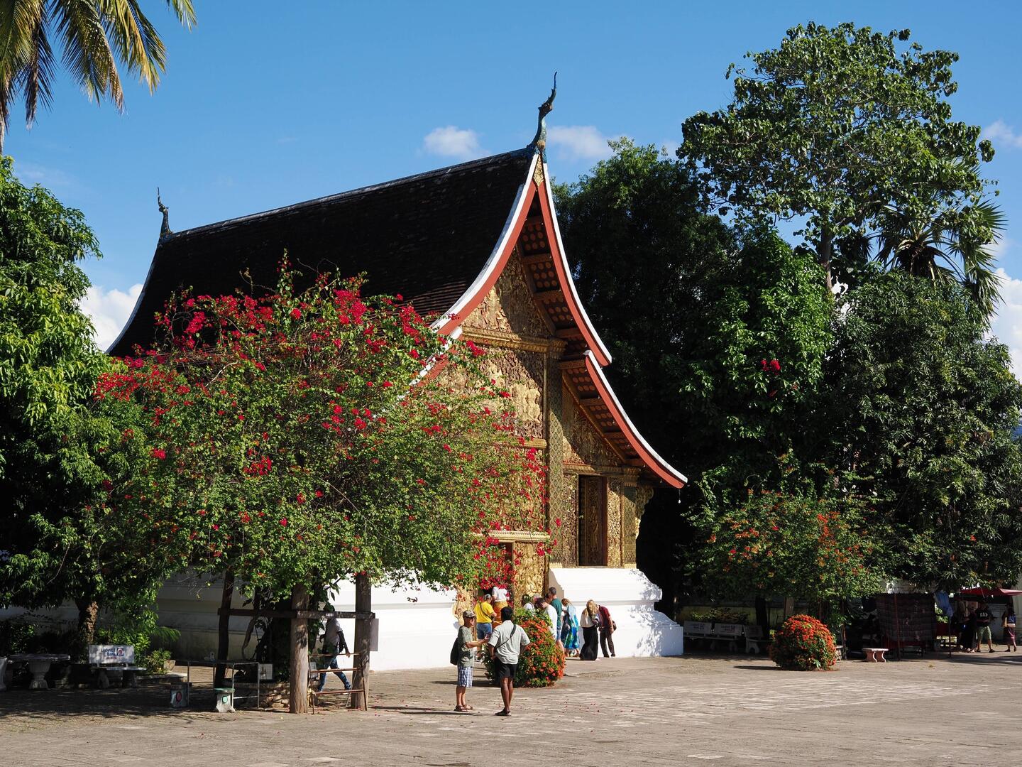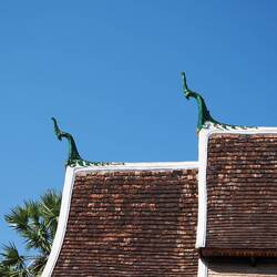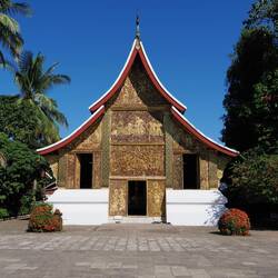 Dort ist auch der Wat Xieng Thong, der bedeutendste Tempel in Luang Prabang. Die Dächer der traditionellen vornehmen Gebäude sind auch gewölbt, aber nicht wie in China und Korea in zwei Dimensionen, sondern nur in einer. Dafür sind mehrere Dächer interessant übereinander gestapelt. Außerdem gibt es ziemlich viel Goldverzierung.