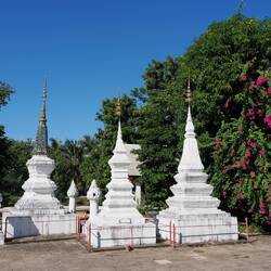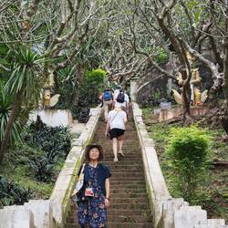 Oben wird man belohnt von einem Fernblick über die Stadt und den Mekong. Wieder unten beobachten wir ein paar junge Leute in Tracht. Evtl. sind das Hochzeitskleider? Der Fotograf hat aber nur ein Smartphone.