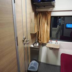 Nur heute ist der Zug ziemlich leer. Ich bin gerade einmal von vorn bis hinten gelaufen. Es gibt eine erste Klasse und da sitzt kein einziger Fahrgast. Die ersten drei Wagen am anderen Ende des Zuges sind komplett voll und der Rest ziemlich leer. Ich glaube, die Firma sollte mal an ihren Algorithmen feilen.