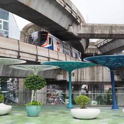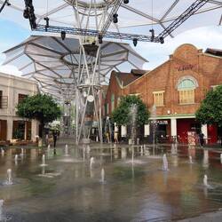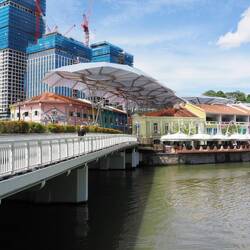 Statt dessen sind wir noch ein bisschen durch die Stadt gelaufen und haben am Fluss ein nettes Viertel entdeckt. Richtig, Singapur hat einen Fluss, und man kann sogar mit Schiffen darauf fahren! Singapur liegt auf einer nicht sehr großen Insel. In diesem Viertel gab es eine Reihe von Sonnenschirmen, die die Straße beschatten. Und unter den Sonnenschirmen hingen designmäßig schön integrierte Gebläse, die einen feinen Nebel verteilt haben, der den öffentlichen Raum gekühlt hat. Vielleicht werden wir sowas in überhitzten Städten in Zukunft öfters sehen.
