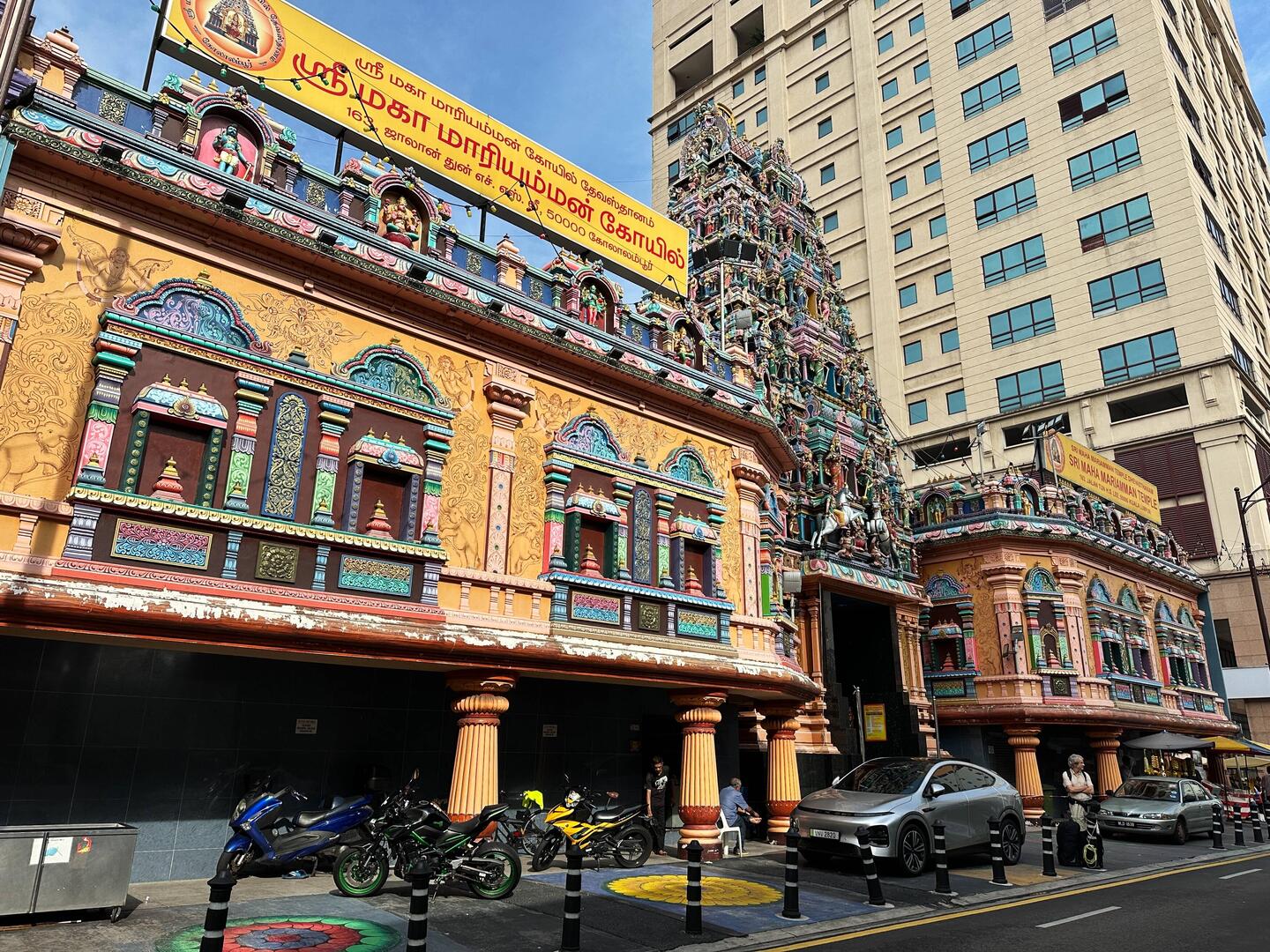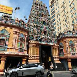 Der Bus fuhr nicht in der City ab, sondern in etwa 15km Entfernung. Da fuhr aber eine S-Bahn hin. Und das war sehr interessant. Der Großraum Kuala Lumpur besteht wohl aus einer Reihe von Unterzentren und dazwischen lagen Bereiche mit Bebauung mit kleinen Häusern und sehr viel Bäumen. Es war schön anzusehen. Auf dem Weg zum S-Bahnhof kamen wir an einem hinduistischen Tempel mitten in der Stadt vorbei.