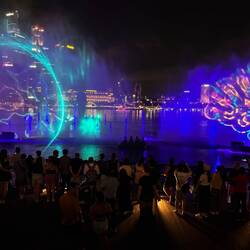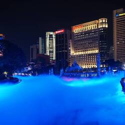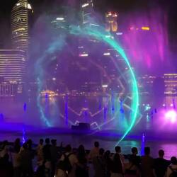 Abends sind wir dann nochmal zur Bay gefahren. Dort wird täglich eine recht spektakuläre Wasser- und Lichtschau gezeigt. Auf der anderen Seite der Bay, hinter der Show, ragten die Hochhäuser in den Himmel. Oben dran stand jeweils, welche Bank da drin sitzt. Der Reichtum hier beruht auf Handel und Finanzwirtschaft. Kleine Länder locken die Finanzwirtschaft ja gern mit Niedrigsteuern an. Ich finde, Banken sollen den Menschen dienen und sich nicht so in den Vordergrund drängen.