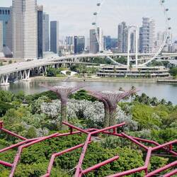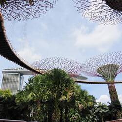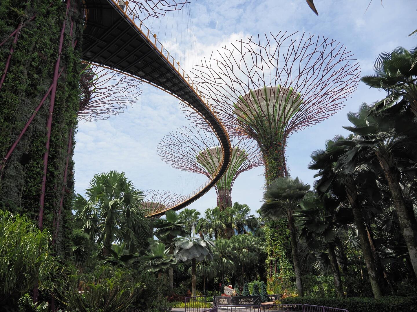 Der erste Tag in Singapur sollte laut Wetterbericht trocken sein, während für Tag zwei Regen angesagt war. Also sind wir erstmal in die Gardens by the Bay gegangen, ein muss für Singapurtouristen. Den Park selbst kann man kostenlos betreten, es gibt aber ein paar besondere Angebote, für die man zahlen muss. Die Hauptattraktion sind zwei spektakuläre Gewächshäuser. Das haben wir auf den zweiten Tag verschoben. Für heute haben wir die Aussichtsplattform auf einer dieser künstlichen Baumstrukturen gewählt. Dort konnte ich einige schöne Fotos machen.