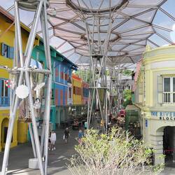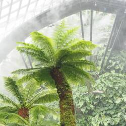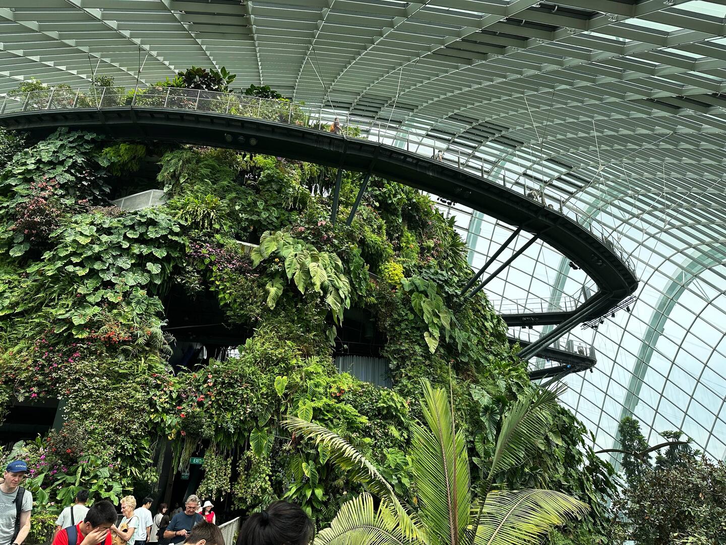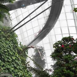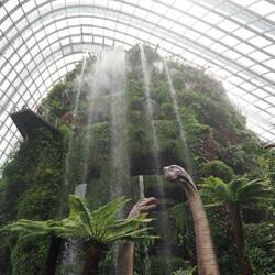 Im zweiten Gewächshaus gab es einen Nebelwald und darin hatten sie lebensgroße Dinos platziert, wohl für das Kind im Menschen. Gleich am Eingang stand man unten an einem riesigen Wasserfall. Sie wollten zeigen, dass die Pflanzen in den oberen Stockwerken ihr Wasser aus dem Nebel beziehen. Deshalb mussten wir Besucher eine Tour über freischwebende Wege machen, die uns von ganz oben wieder nach unten brachten, wobei der Nebel immer dichter wurde. Beide Gewächshäuser waren wirklich sehr eindrucksvoll und wir sind ziemlich lang dort gewesen.