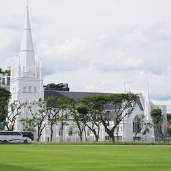 Unser zweites Ziel für heute war ein Museum mit dem interessanten Namen Museum für Asiatische Zivilisationen. Wir sind erst ein Stück U-Bahn gefahren. Wir wussten von der Karte, dass wir am Ausgangs B rausgehen mussten. Der Ausgang B lag aber in einer unterirdischen Mall und dort haben wir uns so gründlich verlaufen, dass wir am Ende ganz woanders rauskamen. Wir kamen dann bei der Saint Andrew‘s Cathedral vorbei - interessante Farbgebung.