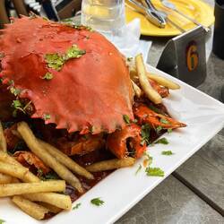 Abends konnte Hea-Jee endlich Singapur-Krebs essen. Das hatte sie im Internet entdeckt, wahrscheinlich wieder bei ChatGPT. Das ist auch so ein Ding für Touristen und ziemlich teuer. Wir hatten das in verschiedenen Restaurants gesehen, darunter auch welche an der Bay Front, der wahrscheinlich teuersten Ecke in Singapur. Aber auch in China Town. Also sind wir nach China Town gefahren und Hea-Jee hat sich ins erste Restaurant gestürzt, wo es das gab. Das war ein Inder. Singapur ist wirklich multikulturell. Es war ihr aber lieber, als beim Chinesen, weil da dann evtl. Szechuanpfeffer drin gewesen wäre.