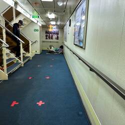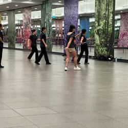 Auf dem Weg dorthin kamen wir in einer U-Bahnstation durch einen breiten Spiegelgang. Rechts und links bestand die Wand teilweise aus Spiegeln, so dass man sich vielfach sehen konnte. Dort hatten sich ein paar junge Leute getroffen, um einen Tanz zu trainieren.