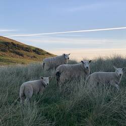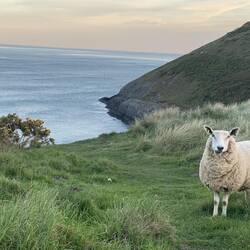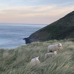 Links ein Schaf, rechts das nächste, in der Mitte ist der Ozean zu sehen...Alles klar, oder?! Roadpartylocation war für unser Dachzelt weniger geeignet...da wird man erfinderisch ;)