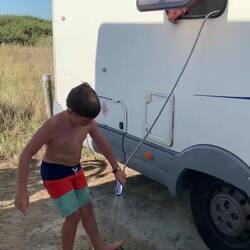 A well appointed municipal campsite on the island complete with inland sea pool. Arousing game of swallows and Amazons with a swan and an inflatable dinghy.