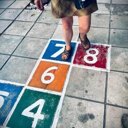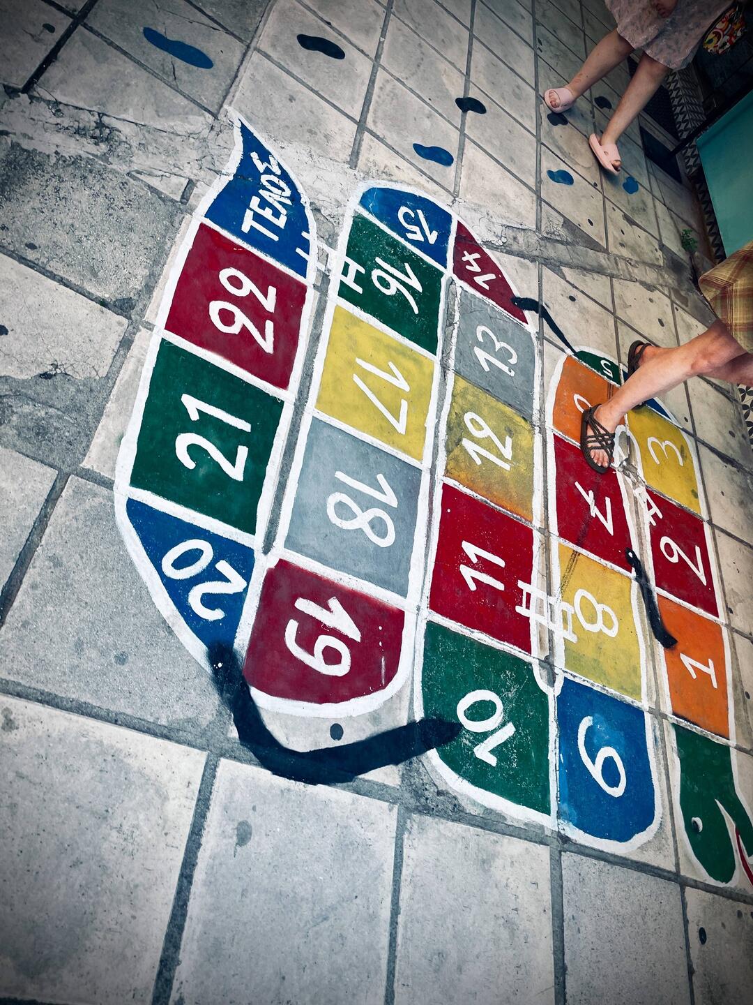Wenn wir vom Balkon im fünften Stock herabschauen, dann prangt dort auf dem schroffen Asphalt ein rätselhafter Schriftzug.