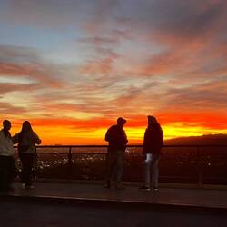 Es war bereits 17:30 Uhr und ich wollte den beiden unbedingt den Sonnenuntergang vom Griffith Observatorium aus zeigen. Schon bei der Anfahrt hatten wir immer wieder einen besonders schönen Blick auf die Wolkenkratzer in Downtown. Es waren ein paar Schleierwolken am Himmel, was das warme Farbenspiel noch schöner machte. Oben angekommen, war leider kein einziger Parkplatz mehr frei. Wir versuchten uns kurzzeitig auf eine schraffierte Fläche zu stellen, wurden dort allerdings gleich wieder aufgefordert weiterzufahren. Immerhin konnten wir vom Auto aus den ein oder anderen Blick erhaschen. 🌇