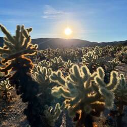 Im südlicheren Teil des Parks, wo die Colorado Wüste beginnt, gibt es außer steiniger Hügellandschaft eigentlich nicht mehr viel zu sehen. Es ist die unendliche Weite, die lediglich von etwas Gestrüpp bewachsen ist, was es dennoch beeindruckend macht. Zudem befindet sich dort ein Kakteen Garten durch den man bestenfalls ohne zu stolpern spazieren kann. Die untergehenden Sonne brachte all die weißen Stacheln zum Leuchten und machte den Anblick richtig magisch. 🌵