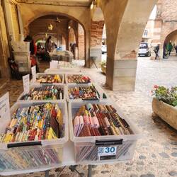 The town is famous for its story of the cats. In 1342 after years of famine all the cats in the town has been eaten . A young girl Angeline had hidden her 2 cats in the attic so as not to be eaten . The next year the crops were bountiful but there was a plague of rats who were eating the crops so Angeline offered her cats to kill the rats as long as they were looked after. The cats saved the day and now there are stone sculptures cats on the houses.