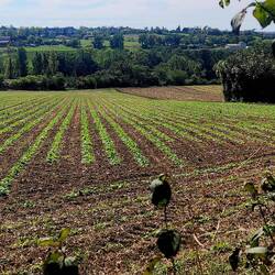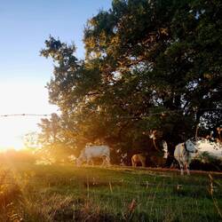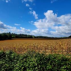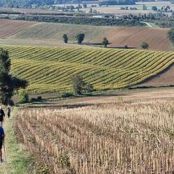 Today the sun was shining all day and luckily quite a bit of the walking was under thickets of oak trees. Lots of rolling pastures with newly ploughed ground and the last of the sunflowers.