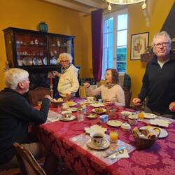 Our accommodation last night was special as our hosts Marilyn and Michel were so hospitable sitting at the table with us as if we were old friends. They hardly spoke and English but we did have another French couple who spoke very good English so we all managed well. Plus Jane is very good now with her French and can communicate very well. It's so nice at times to be part of a French household and we even had the young border collie x wanting us to throw a ball through dinner. We had a 4 course dinner including pork terrine and beautiful wines. We are now in the area of gascogne wines.