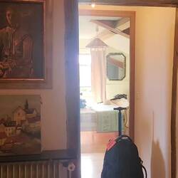 Our accommodation is pretty amazing in a very old building with big wide oak floorboards and big old wardrobes .