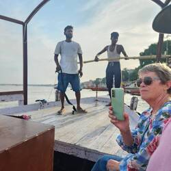 We got down to the banks of the Ganges and it is quite an emotional experience to witness all that is going on down there with hundreds of people on the banks immersing themselves in the holy water where Pilgrims come across the world to to worship it. It is suppose to expiate your sins and cure all ills! Looking at the state of the water I would think it may give you some ills. Onto a small boat we went and puttered down the Ganges ...for the faint hearted maybe don't read the next sentence. Along we came to the pyres where the cremation of bodies goes on 24/7 and it's all happening as we boat pass. Only men of the family can be there and the body at least is covered in a cloth but.. it was all very sombre but also very grounding . Apparently once the body is burning they have to crack the skull open so God can get out!