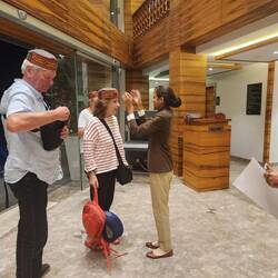 We had an amazing welcome into the beautiful hotel set amongst firs and pine trees and all given the little fez type Indian hat.