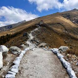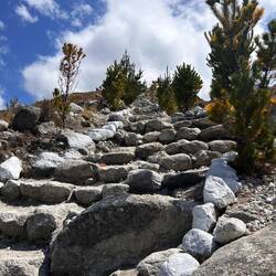 Dopo colazione 🍳 🍞 🧈 , Manu prende un collectivo per andare a Pitec per cominciare la camminata 🚶 il sentiero comincia con una serie di scalini sterrati accostati da una fila di pietre bianche 🪨 ⚪️ per delimitare il sentiero. Impossibile perdersi.