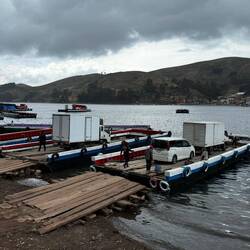 Ci fa sorridere, vedere come grandi camion e bus vengano caricati su zatterone di legno 🪵 che sembrano costruite un po’ a casaccio. (Il giorno dopo vedremo che il governo boliviano ha stanziato dei fondi per costruire un ponte)