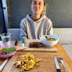 Der Morgen startete bedeckt und grau. Das gesamte Ferienhaus stand schon im Zeichen der Abreise. Gepackte Taschen, Putzzeug und etwas gedrückte Stimmung. Ein letztes Mal Wasser aufsetzen für die zwei Kannen Kaffee am Morgen. Ein letztes Mal Rührei aus zwölf Eiern. Wir schoben alle Reste zusammen und zauberten ein üppiges Frühstück. Es war zwar kalt aber trotzdem aßen wir draußen. Danach machten wir ein letztes Mal den Geschirrspüler an, räumten die letzten Sachen ins Auto und übergaben die Wohnung wieder an Carlos, den Besitzer. Nach einer halben Stunde Fahrt erreichten wir den Flughafen in Olbia, wo wir die Anderen verabschiedeten. Wir wollten gerade vom Parkplatz runterfahren, als das Dachfenster bei der Höhenbegrenzung hängen blieb und in zwanzig Teile zersprang. Dennis kletterte gleich aufs Dach um den Schaden zu beheben, während ich die Teile einsammelte. Als die Anderen noch mit im Auto saßen, lag es anscheinend so tief, dass wir durch die erste Höhenbegrenzung einfach durchfahren konnten. Durch die zweite leider nicht. Der Ärger war jedoch schnell verflogen, denn es hätte durchaus schlimmer kommen können. Der Verschluss funktioniert noch und die Solarpaneele sind ebenfalls unbeschädigt. Glück gehabt. Auf den Schock haben wir uns erstmal zu den Anderen gesellt und gemeinsam einen Kaffee getrunken. Ihr Flieger ging erst in ein paar Stunden, weshalb wir nochmal eine gute halbe Stunde zusammen lachen konnten. Dann war es aber wirklich an der Zeit Abschied zu nehmen und unseren holprigen Start in Sardinien hinter uns zu lassen. Wir machten uns auf den Weg zum Lidl und einem Baumarkt. Danach suchten wir einen schönen Stellplatz auf. Kaum war der Motor aus, begann der Regen. Wir spannten die Wäscheleine im Bus, denn unsere gewaschenen Sachen aus der Unterkunft waren leider noch nicht vollständig getrocknet. Zum Abendbrot gab Burger und Blumenkohl-Wings. Nicht ganz geglückt aber trotzdem lecker. Dennis verabschiedete sich ans Handy und ich begann damit die ausgedruckten Bilder an der Wand zu befestigen. Nun ist es schon fast um 12 und ich werde jetzt versuchen zu schlafen. Czytaj więcej