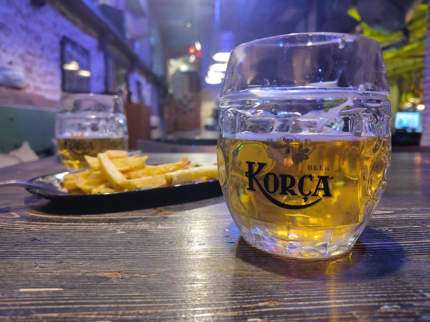 Wir wundern uns, warum so wenig Leute an einem Freitagabend in der hauseigenen Brauereibar von Korça sind, denn es gibt köstliches Bier frisch ab Zapf für umgerechnet 80 Rappen/Cent pro Glas. Das Essen ist auch ordentlich.