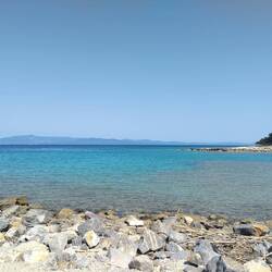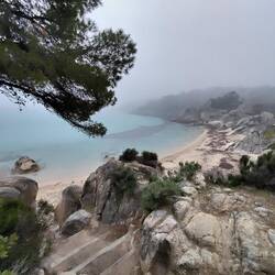 Weiter gehts zum 2. Finger Sithonia, kurz Wassertanken, Espresse freddo getrunken und einen schönen Waldplatz gefunden. Um uns herum blüht viel Lavendel. Am nächsten morgen gehen wir zum Paradisos Strand hinunter, es ist mystisch neblig, aber noch kein Badewetter.