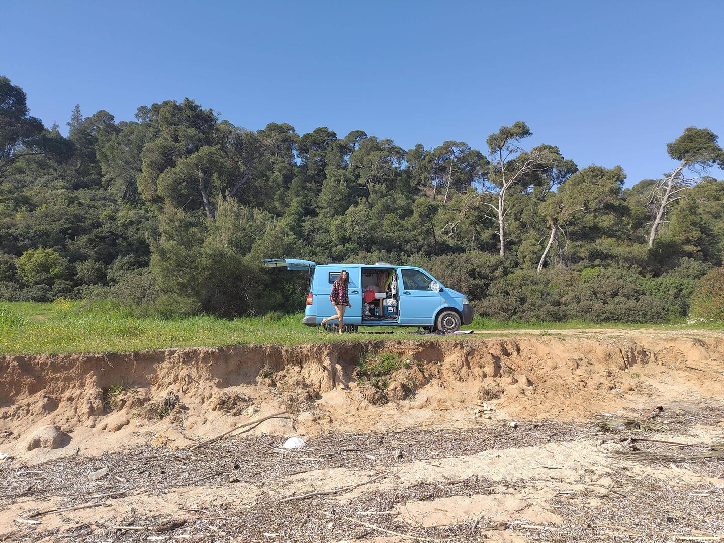 Wir sind nach einer Woche Thessaloniki wieder unterwegs mit unserem Bus. Es geht los zur Halbinsel Chalkidiki. Auf dem ersten Finger Kallithea machen wir in einem Waldstück nach Kassandra halt, weil es an der Küste noch viel windet.