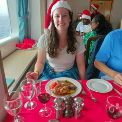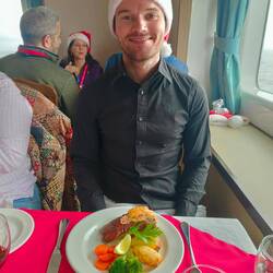Directly after the lecture we went straight into our recap and briefing for the day. Tomorrow we will get to go on land! Straight from the recap we all made our way upstairs to the dining room for Christmas dinner (my hypothesis is that we might camp tomorrow night, so Christmas dinner is tonight instead). Christmas dinner was nice! I got the meat with Yorkshire pudding and Allan had lobster. We had chocolate yule log for dessert and even got some complimentary wine poured during dinner too.