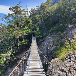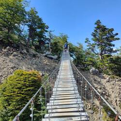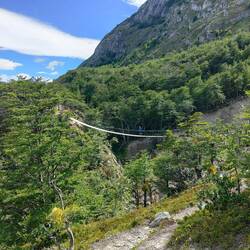 We were moving quicker this morning because we didn't take our bags with us, the path was relatively flat to start out with through the forest, and then about 20 minutes in got a bit steeper. We continued another 15 minutes and came to our first suspension bridge over a river/small gorge area. The bridge was really fun to walk across and you had a nice view of Lake Grey and Glacier Grey. I wasn't sure if I wanted to keep going, but Allan spurred me forward another 35 minutes to the next lookout and suspension bridge. We had an even nicer view of the glacier. Allan then went across the bridge a little bit further to another viewpoint.