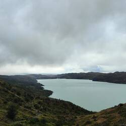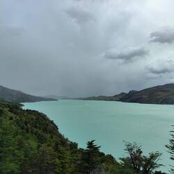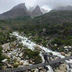 We continued walking feeling optimistic that the worst of the weather passed in the night...but once we got down the hill not long after our semi clear view at the top, all hell broke loose. We were walking alongside the lake on a rocky beach when strong gusts of wind began to blow us around and the rain was blowing right into us. Then, the strong wind and even stronger gusts were cooked with torrential downpour as we continued walking. It was not pleasant and the peaceful lake was now very rough. We came up to a stream, that was now a raging, impassable river. We saw a group of people about 30-50 meters up the river making a go at getting across so we joined the group up there. After waiting a while, two kind men helped people across. First they took backpacks and threw them to the other side. Then, you had to straddle over the raging water, or in my case jump with the help of a man shoving you along to another man on the other side. After that, we had to walk across some flooded shrubs which is when water rushed over my feet soaking them. Shoes full of puddles, and soaked through jacket, t-shirt and trousers, we continued to Los Cuernos, a camp on the way to Chileno (our stopping point for the day).