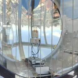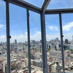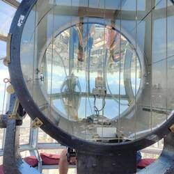 We then took the elevator up a few floors to Purgatory. Here there's fewer colors and the walls are a bit plainer. We also could see down a circular opening into the main foyer. This is to cast your sins into Hell before you continue moving up through the building. We got into the elevator again and went up to floor 14 where we got our and climbed the rest of the stairs up to floor 20. The staircase got much narrower the closer we got to the top. Once at the top, we'd reached Dante's Heaven. It was the plainest here with no color or decoration. We had great 360° views from a few different openings in the tower. We also got to continue going up an even narrower staircase to the lighthouse at the top of the tower. The lighthouse had the large light in the middle that gets lit at 10pm every day for 10 minutes. Our guide turned it on, and as if rotated we saw our reflections upside down. It was pretty cool!