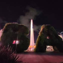 The obelisk didn't look that big from far away, but as we got closer, the big bricks were much bigger than I thought. The white stone had red lights shining on it and some words engraved on each side of the obelisk. We walked around the other side and took a picture with the obelisk and the letters B and A cut in hedges.