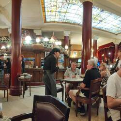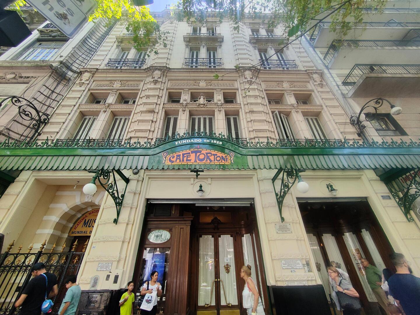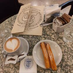 Our second day in Buenos Aires was also spent exploring more of the historic center. We started our day with coffee and dulce de leche churros at Buenos Aires' oldest cafe, Cafe Tortoni. It definitely has an old timey feel and was much bigger on the inside than I expected. The main dining area had wooden tables and some different chairs at each table. There was also a lot of dark wood panelling on the walls and at the large bar area. After we ordered, the waitress brought our coffee and churros accompanied with Cafe Tortoni napkins and little coffee cookies. The back of the cafe had some separate rooms. One of them was more tables with different antique tango show posters. A second one had velvet curtains that revealed a small room. Inside was a stage and some chairs. They must have intimate tango shows there.