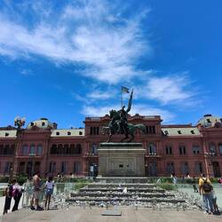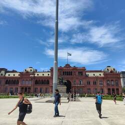 After we left Cafe Tortoni we continued walking down the tree-lined street towards Casa Rosada and Plaza de Mayo. The Congress is at one end and Casa Rosada at the other. The plaza was bright and very white with all the stone. There were some palm trees and a variety of interesting buildings around the edges. Most notably, was Casa Rosada, the President's house. It was an old fortress now turned residency. It was very pink and had statues at the very top in the middle. The one on the back side of the house was pretty big too!