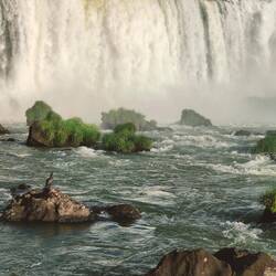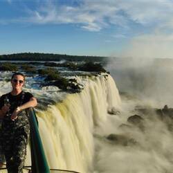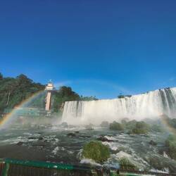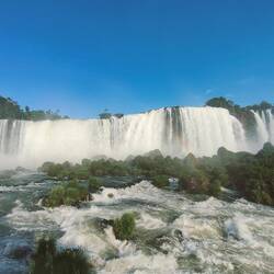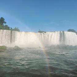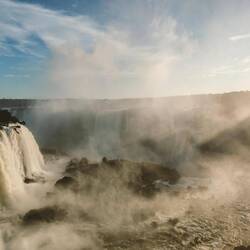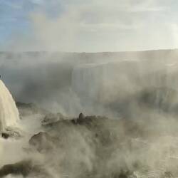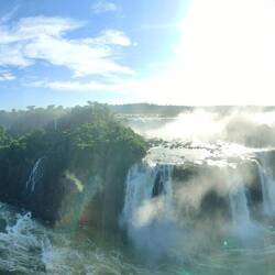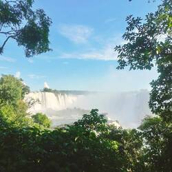 When we got to the end of the trail, we saw the biggest waterfall so far that connects to Devil's Throat. It was a powerful flow of water with no breaks along the cliff it was falling from. We walked along a misty path over the water to get a better view of this waterfall and of Devil's Throat around the corner. The water was so powerful it was splashing a fair amount of mist and spray onto everyone that walked the path. We had to be quick with our pictures and videos so that they did not get blurry. The sun was shining brightly, so there were plenty of rainbows from a variety of different angles.