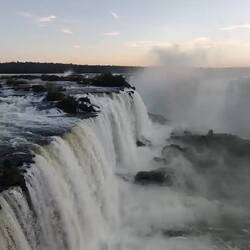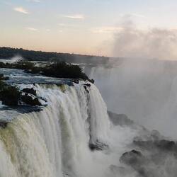 Finally, we took an elevator to the top of the viewing platform. We were greeted by men serving drinks who offered us Brazilian sparkling wine, Brazilian white wine, fresh orange juice, coconut water (from the coconut), and sparkling water. It was all very nice. There was also someone playing music on the platform for ambiance. We got our drinks, and made our way to the edge of the viewing platform for higher look at the large waterfall as well as a great panorama of the smaller falls on the Argentinian cliffs. The camera has a harder time picking those up with the lowering sun and mist, but the view was memorable.