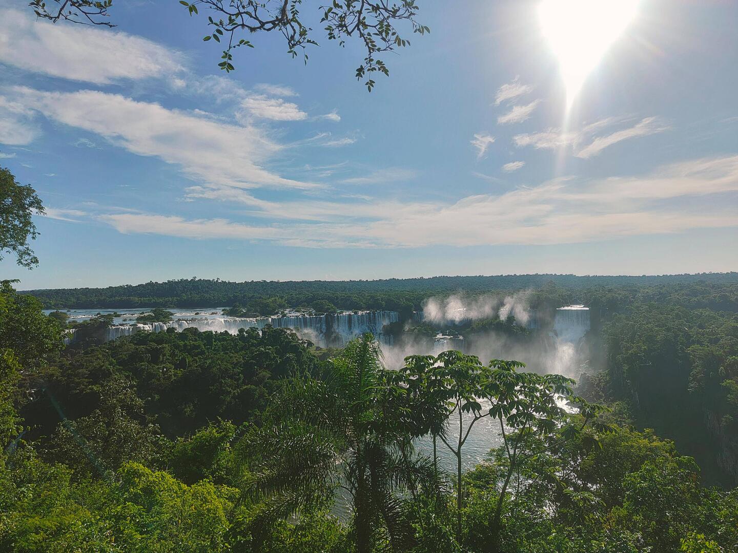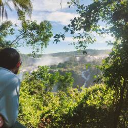 After we crossed the bridge, we waited in a longer line at Brazil's immigration. We were hot, sweaty, and ready for this crossing to be done. After we got our passports stamped, then came the trickier part of getting from the border to our hotel. Previously, Allan has had data roaming, but he doesn't have it for Brazil so we couldn't get an Uber and there were no taxis in sight. It was also pretty chaotic with people walking to and from Paraguay with shopping, motorcycles, buses, and cars driving everywhere. We couldn't see our bus, so we waited a bit, and then decided to take our chances on a taxi. Allan also intermittently had Paraguay service that we tried to use to get an Uber. While trying for an Uber, our second bus drove past us! We flagged it, but it drove right past us 🙃. Luckily, after many attempts, we managed to get an Uber to the hotel. We checked in, but didn't linger long because we had to get to the Falls for a sunset tour.