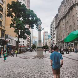 We continued walking down Rua XV de Novembro and it brought us to a small square with some lovely buildings around it. The one in the center was Sesc Paço da Liberdade. It was a tan building with clocks and small domes. We went inside up to the third floor and walked around a rather interesting art gallery. The female artist had displays of broken porcelain, painted slices of cake, old metal sinks with various styles of dirty glassware arranged, and what looks like was a performance piece of eating a chicken. There were pictures of her eating the chicken, and the carcass was on display in a glass case. It was definitely funky and not the kind of art that I fully understand or can appreciate.