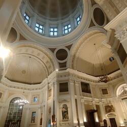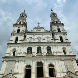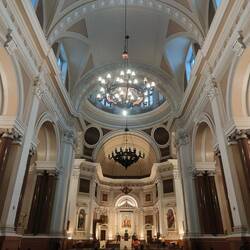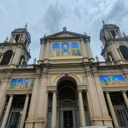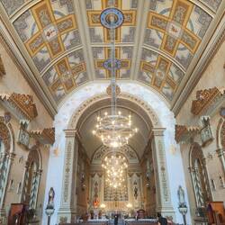 When we docked back at port, it was still raining. We quickly walked about 5 minutes to an açai place, where they also oddly sold lots of Scottish whisky. We had açai while we waited for the rain to stop. It did lighten up a tiny bit, so we half ran up the street about 10 minutes to the cathedral. We weren't too wet in the end thankfully. It wasn't ornate inside. The cream and brown tones were very neutral, but also helped keep the space light. There were lots of archways and a large dome in the center before the altar. There was also some nice stained glass near the dome. This church is not old and was started less than a hundred years ago, hence its modern facade outside and stripped back interior.