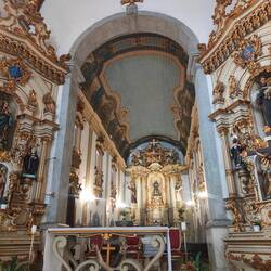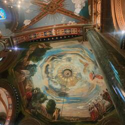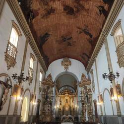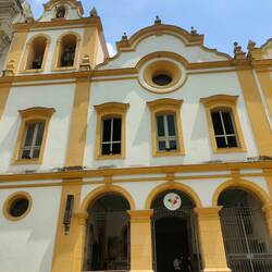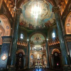 We visited the Circolo Italiano, the building made by the German for Italian immigrants, and the Copan building, the building made by Oscar Nehemeyer, first. We got to see more of the wave in the Copan building than we saw with the guide. It was easier to see the full shape of the building where we stopped rather than where the guide took us. We continued our walk to Paróquia Nossa Senhora da Consolaçã. I love this church. The way the exterior looks reminds me of a tower on a princess castle in a Disney movie. Inside the artwork was pretty spectacular with deep blues and greens with gold. The green marble columns added a dramatic touch to the paintings too.