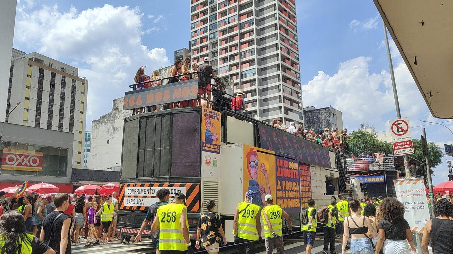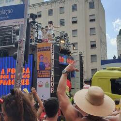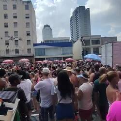 After sitting in Starbucks for a couple of hours to try to get something sorted for Rio the first few days we are there, we went back towards our hostel from last night to see what the street parade was like. We saw vendors and police getting set up when we left in the morning and were told it started around 13:00. The São Paolo Carnaval app confirmed this.