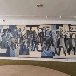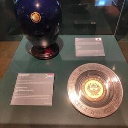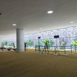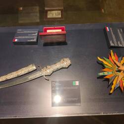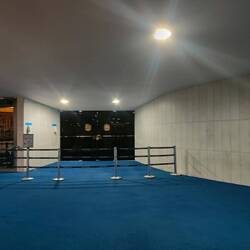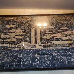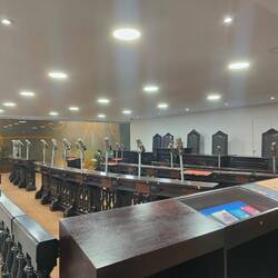 Still on the phone giving our details, we walked from the Palace up the sidewalk past the Congress fencing, and back down the long ramp to enter the building. We got checked in with plenty of time, and they also gave us a postcard to send from the building for free. It was a nice touch. When the tour started, We walked with our small group to the main foyer. The carpet was a puke green color, which was strange, but there was a lot of statues and artwork in this main entrance area including a blue and white mosaic wall with light streaming in from windows at the Three Powers Plaza. In one of the small rooms off of the large green room, was a room displaying gifts from foreign governments to the Brazilian government. Some of the gifts were beautiful and thoughtful, and others weren't (looking at you France and UK...). Some of the gifts were broken, and through our transcription of the tour guide and a sign nearby the broken items, we read that there was an insurrection, and citizens stormed the Congress and destroyed many things in 2023. We were surprised they still ran so many tours a day despite this.